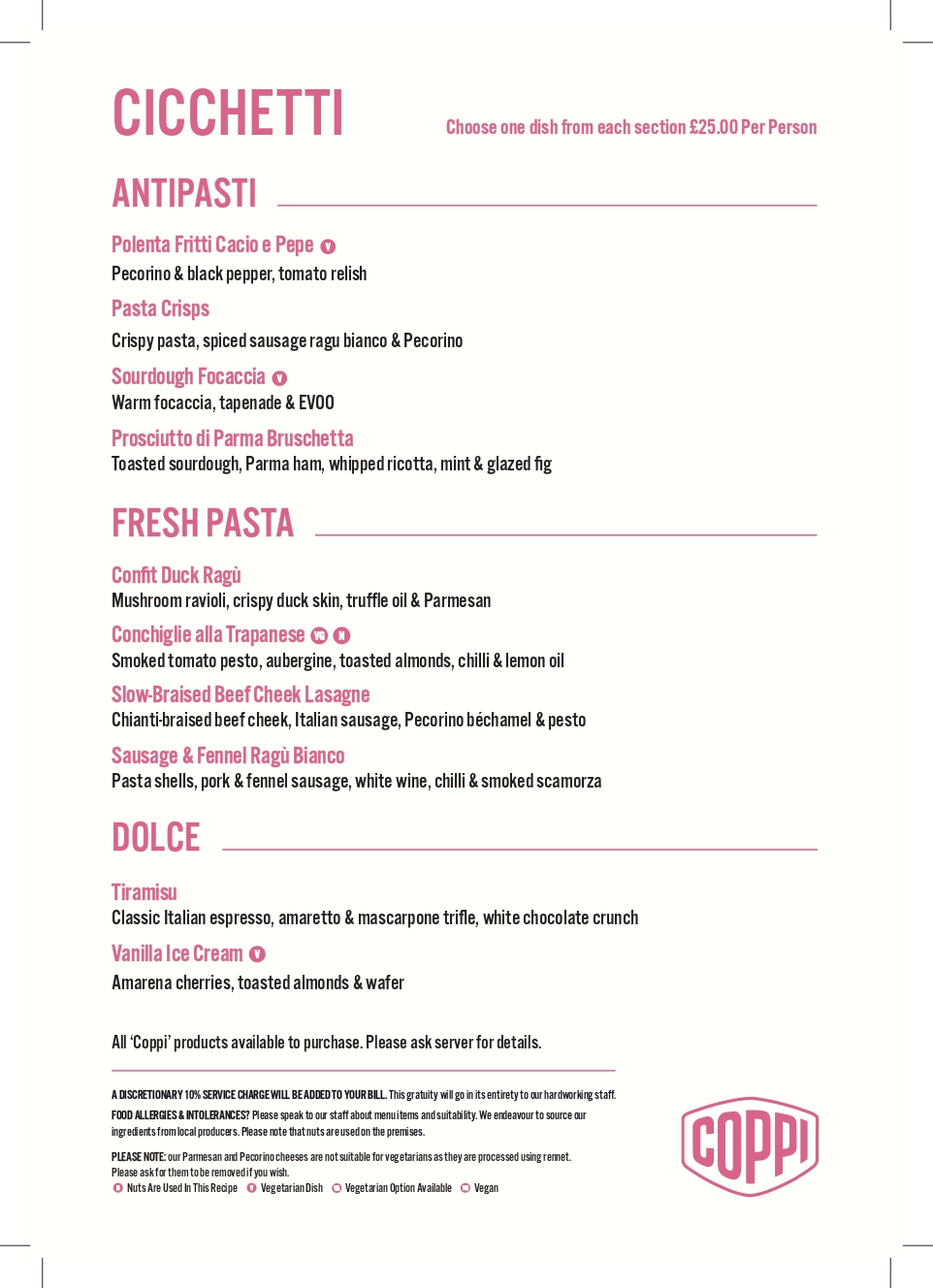 3 course menu for £25 per person, including starter, pasta main course and tiramisu or ice cream dessert