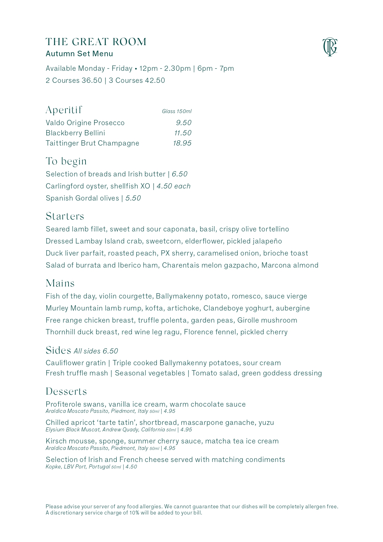 Autumn Set Menu Two Courses £36.50 Three Courses £42.50
