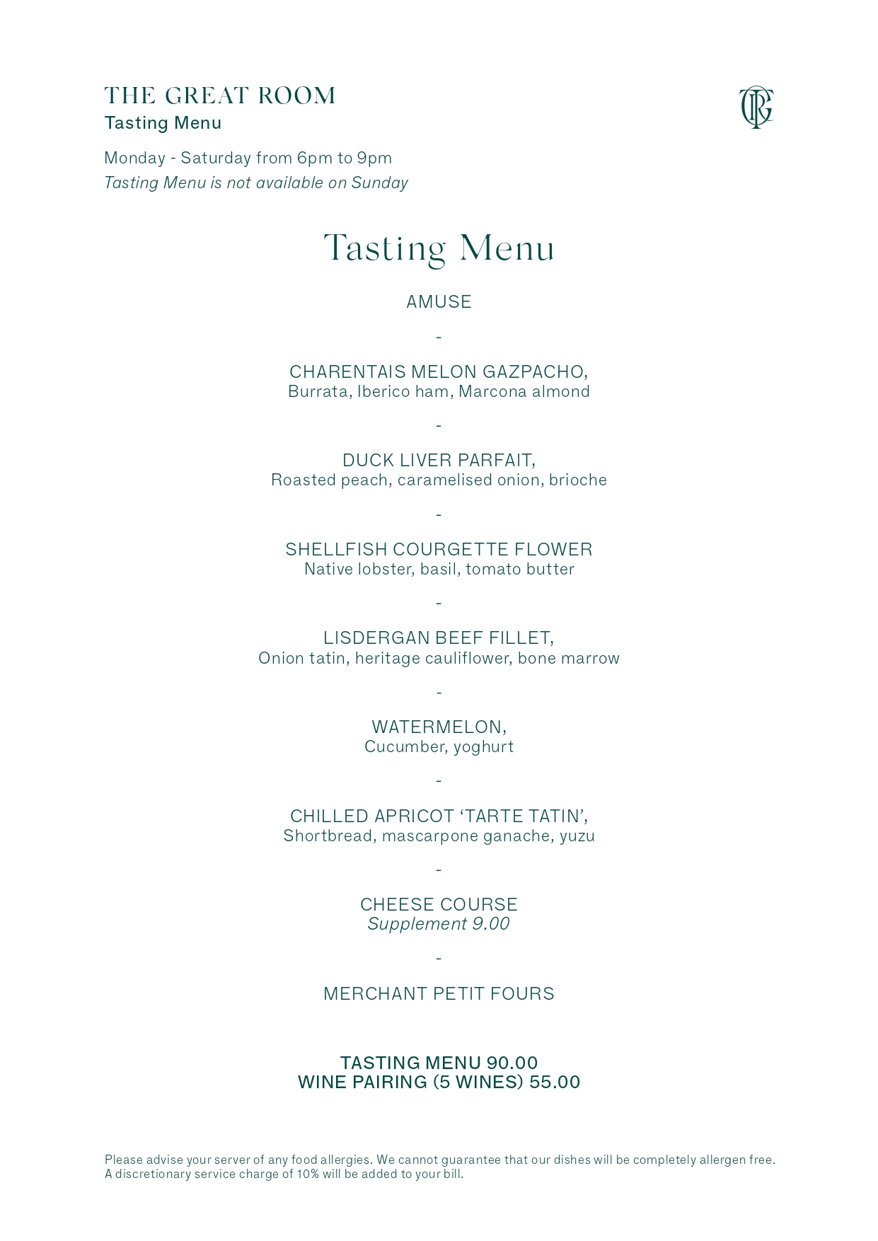 Tasting Menu An eight course menu highlighting the very best of The Great Room Restaurant £90.00 (Optional Wine Pairing £45.00)